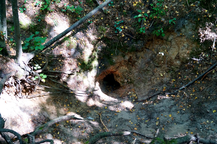 В одну из своих поездок с ночевкой на озере Карасево, что в 2-х км к югу от Рылького, мы довольно много нагулялись в тех местах и насмотревшись на живописные сосновые боры к югу от Рылького и озера Рязаново, на склоне одного из многочисленных карстовых провалов нам все же удалось найти одну из пещер, которая на самом деле оказалась искусственного - рукотворного, вернее лапатворного происхождения. Лазить в эту нору, как Винипухи мы конечно тоже не стали.