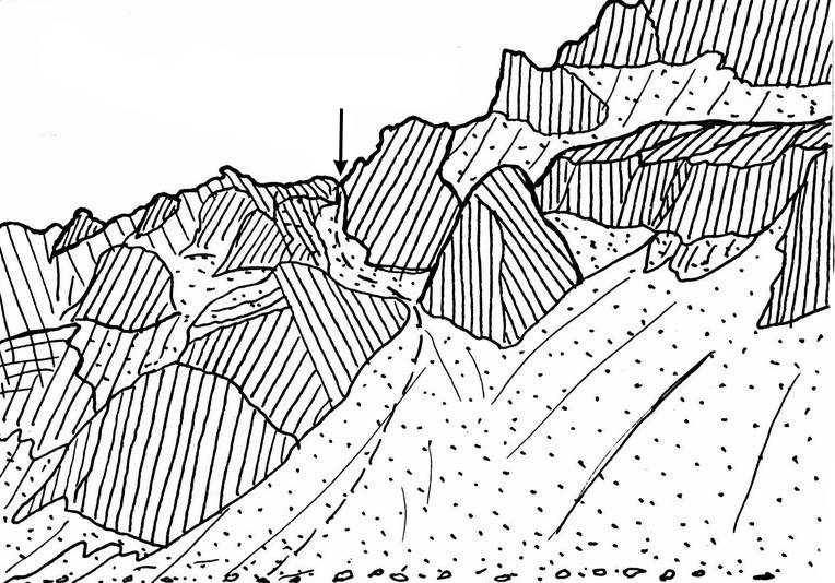 Перевальный взлет около 350 м, начинается со снежно-ледового склона. Плотный фирн около 100 м крутизной до 30°. Дальше крутизна возрастает до 35-40° (100 м) до площадки. От контрофорса, отходящего от гребня, - 1,5 веревки, 40 м по ледовому склону крутизной 50°. От жандарма подъем вверх по простым сильно разрушенным скалам (страховка попеременная). Крутизна участка до 45°. Затем пересечь вправо ледовый кулуар (перила), подъем вверх 40 м и снова пересекать вправо ледовый кулуар (перила). Через 60-70 м подъема по скальному склону крутизной до 45° (попеременная страховка) выход на седловину.