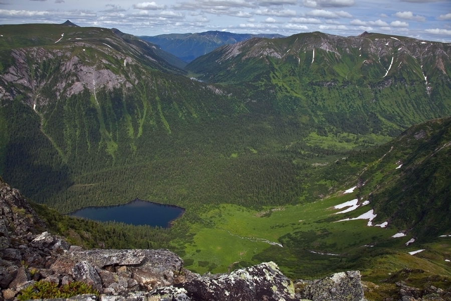 За перевалом (в зоне леса) виднеется вытянутое озеро. За ним, на дальнем плане, долина реки Орзагай (вытекает из-под ледника Кусургашева).