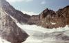 Спуск начинается сразу от тура (ориентировочно). Навеска спусковой веревки 40 метров до хороших скальных выходов. Дальнейший спуск возможен без страховки, но плотной группой по несложным скалам вниз влево до снежника. Переход от скал к снегу со страховкой, возможны трещины, засыпанные снегом. Ледопадный участок лучше всего обходить с левой стороны по снежнику и бараньим лбам, покрытым осыпным материалом. Второй ледопадный участок обходится по левой стороне с выходом на левобережную морену. На ней есть площадки для палаток. С морены в средней части перейти на тело ледника. По нему, обходя трещины, выходить на самую середину ледника Кшемыш. На моренных островах можно установить палатки. Дальнейший спуск вниз по леднику до зеленых полян, которые находятся под перевалом Кироксан.