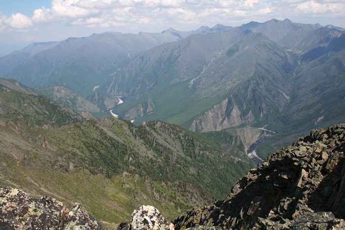 Вид на Оку и порог Мельница со скал над устьем Тэргэтэ