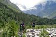 Подъем в 7:00. Выход в 8:30. Продолжаем движение по той же тропе, которая местами теряется, кое-где стоят туры. Тропа сначала выходит на сухое речное русло, а потом, оставляя реку далеко внизу, уходит вверх и вправо через лес. В лесу много грибов. Наконец, тропа круто падает вниз серпантином и выходит на поляну. Река далеко слева обрывается красивым водопадом. Пересекаем русло небольшого ручья и выходим к дороге, недалеко от памятника первым восходителям. Вдоль ручья растут густые заросли облепихи. Если не собирать грибы, то весь путь займет примерно 2 часа. На берегу ручья варим обед - грибной суп и облепиховый компот.