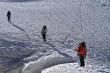 Подъем в 8:00. Выход в 10:30. Выходим на открытый ледник, надеваем кошки и 40 минут идем по нему, затем еще 20 минут по ледниковой морене. Выходим к бараньим лбам. Здесь много мест под палатки. Справа течет река и виден красивый ледопад. Разведываем места возможного спуска. Принимаем решение спускаться по центру бараньих лбов. Можно спускаться слева, в скальном кулуаре, но там есть опасность падения камней, да и спуск по водопаду в нижней части - не самое приятное занятие. Провешиваем 50 метров перил, по очереди спускаемся на небольшую площадку. Здесь закрепляем еще одну 50-метровую веревку и спускаемся к подножию бараньих лбов. Чуть ниже провешиваем еще 30 метров перил, спускаемся еще немного по руслу ручья, проходим мимо водопада. Встаем на обед возле большого приметного камня в 100 метрах ниже последней ступени водопада.
