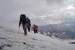 Отдохнув, поднимаемся по снежному склону к подкове, за 25 минут достигаем кратера Восточной вершины. Отдохнув, начинаем траверсировать склон, немного теряя высоту. Тропим снежный склон. В середине склона попадаются ледовые сбросы, которые обходим снизу, после них начинают встречаться закрытые трещины. При большом количестве снега склон может быть лавиноопасен. Периодически меняем ведущего, все сильно устали. В 17:00, наконец, достигаем скал Пастухова. Погода окончательно портится, идет снег, сильный ветер, очень холодно. На скалах много палаток. Как выяснилось позже, все уже несколько дней ждут хорошей погоды. Находим удобное место, ставим лагерь. Ужинаем и ложимся спать в надежде, что ночью небо прояснится.