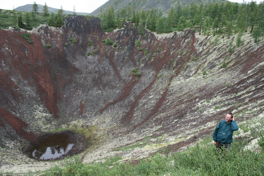 \"Интересно, какое в кратере многоцветье - красно-бурый и темно-серый у вулканического шлака. Там, где он покрылся мхом, добавляются светлые тона. Островки травы и кустов ярко-зеленые\".