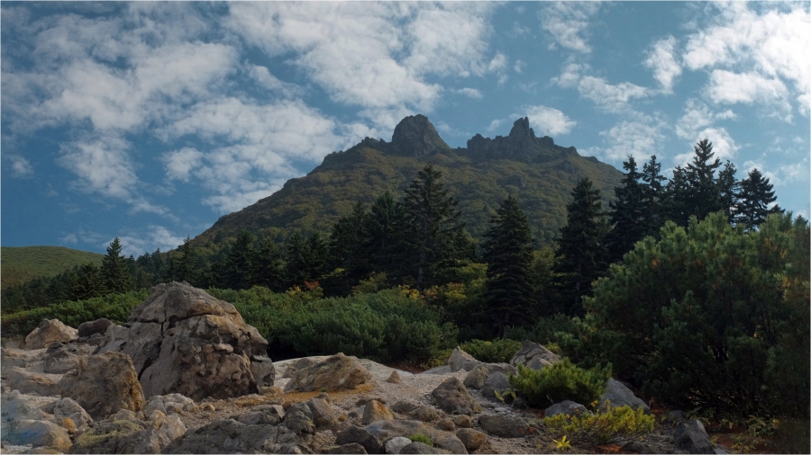 Кунашир. Вид с фумарольного поля на вулкан Менделеева. На вершину ведёт набитая тропа с большим уклоном. На отдельных участках натянуты верёвки, что вполне оправдано.