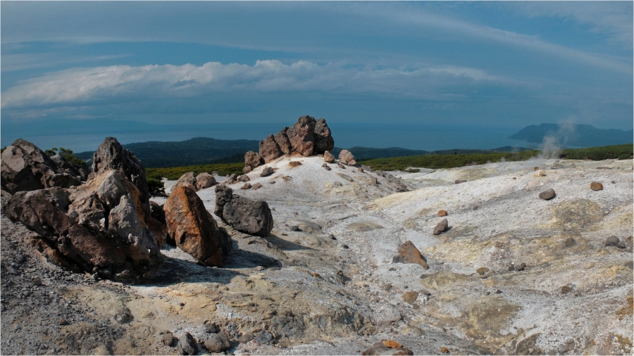 Фумарольное поле вулкана Менделеева. Камни на фото - вулканические бомбы.