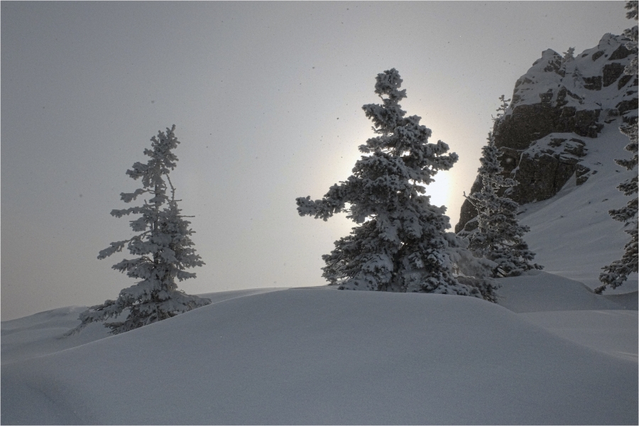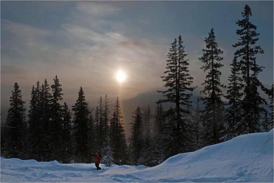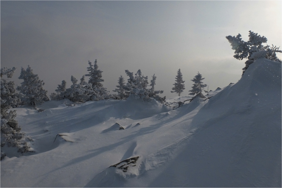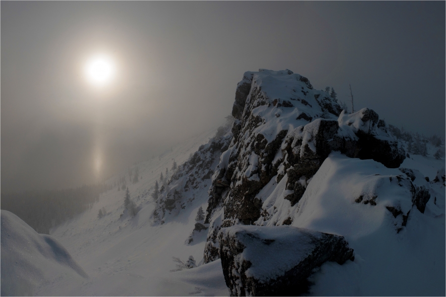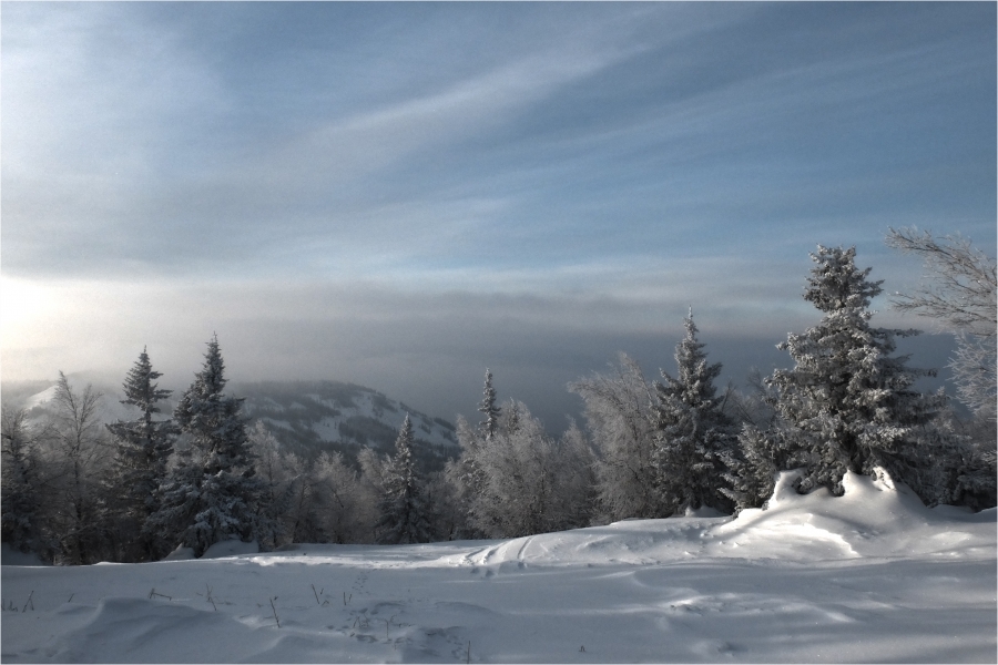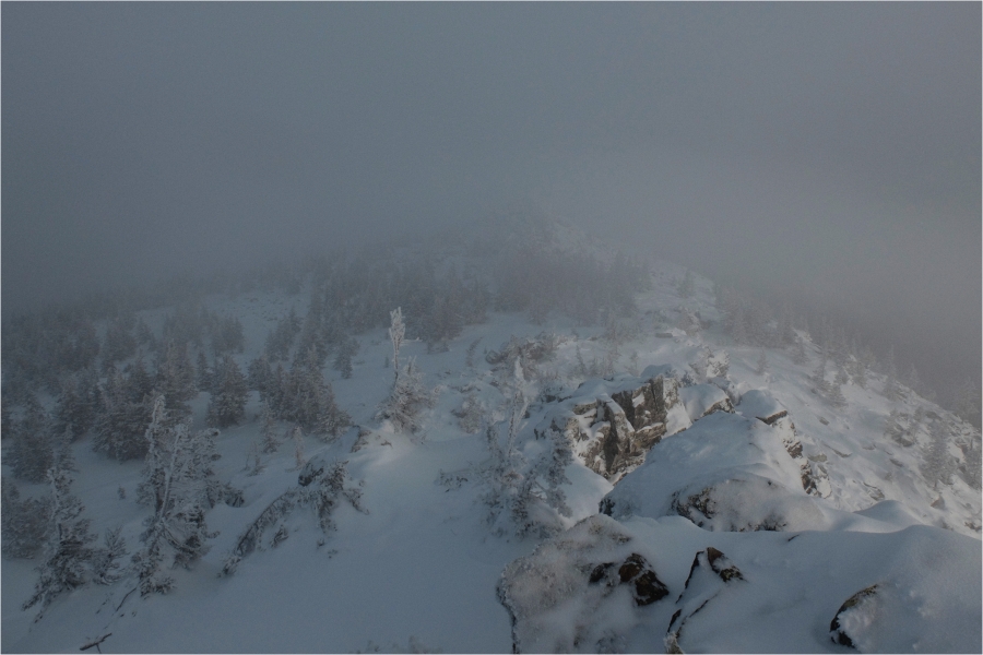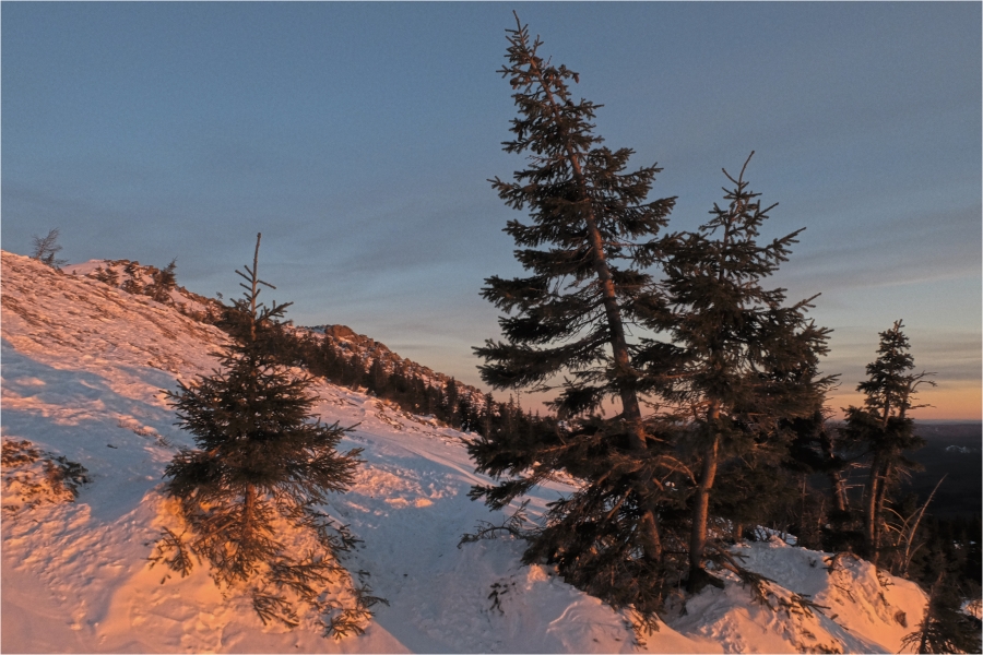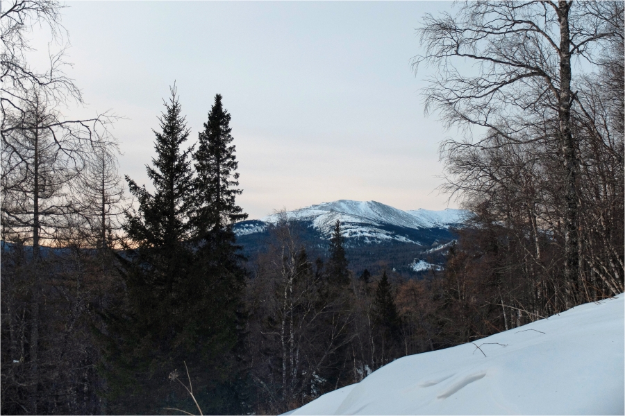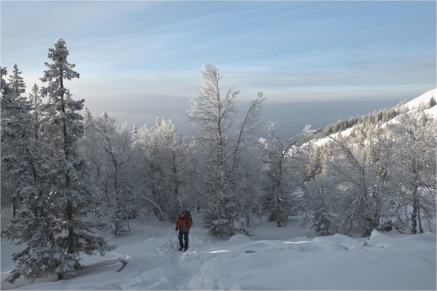 Начало маршрута – пос. Катавка. Раннее утро, а по факту ещё ночь, посёлок спит. Мороз около -27 градусов, стоять холодно, поэтому не тормозим. На Сибирский перевал ведёт снегоходка, видны и многочисленные человеческие следы. Подниматься удобно. На седловине вправо отходит тропа на г. Большая Сука, немного проходим по ней со всем грузом и оставляем его у приглянувшегося дерева. Дальше в радиалку. Тропа не везде набита, местами проваливаешься по пояс, есть настовые крутые участки, где жалеешь об отсутствие кошек.