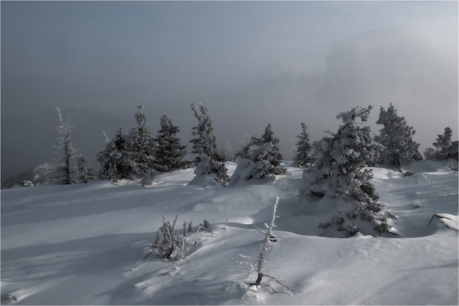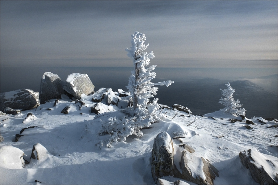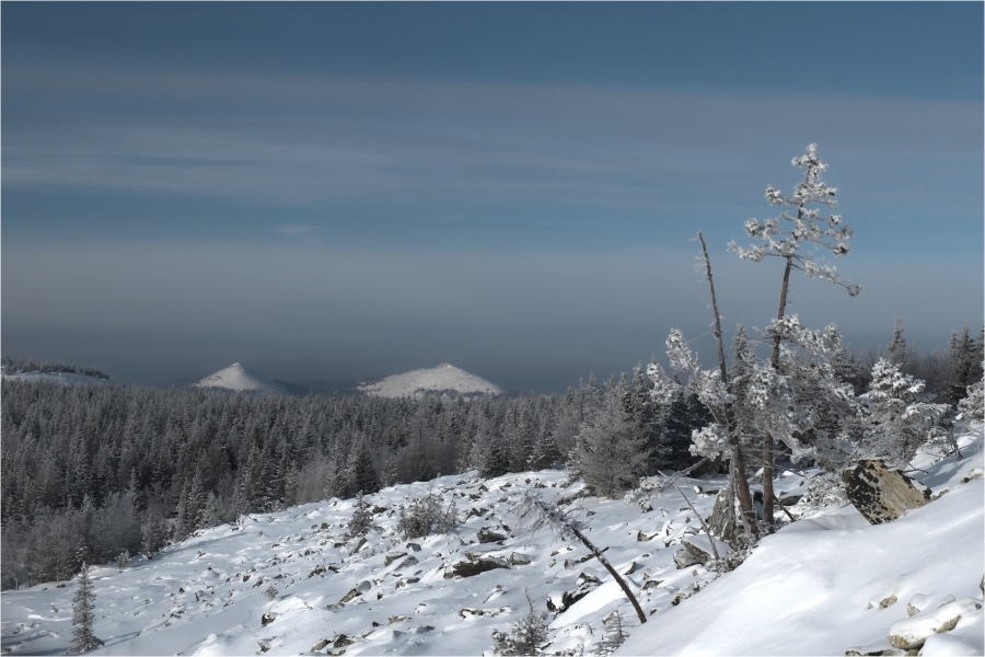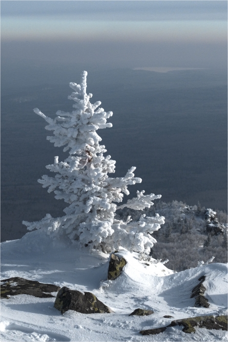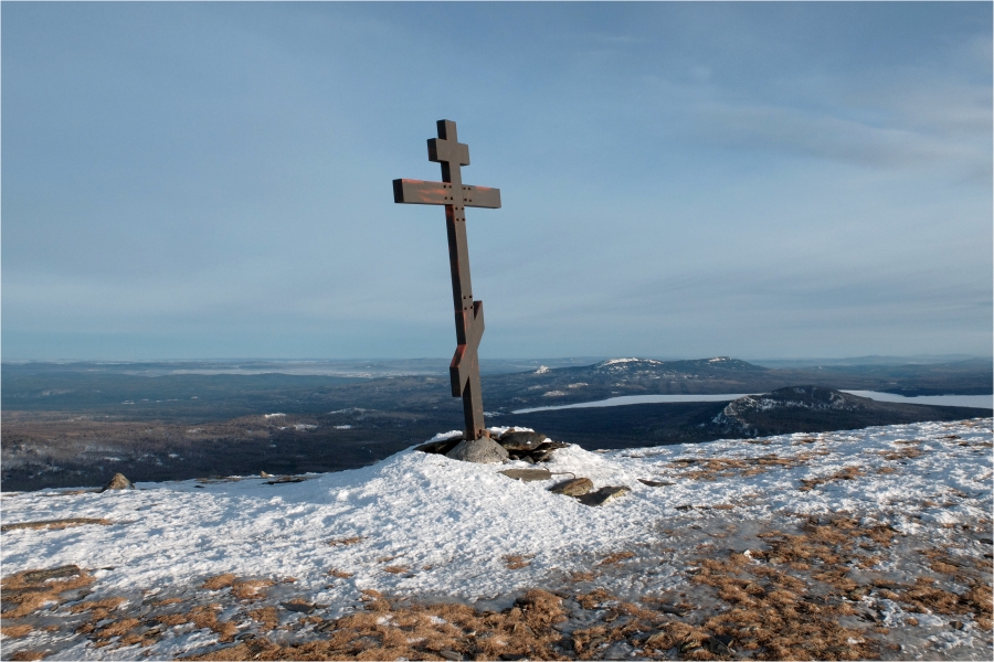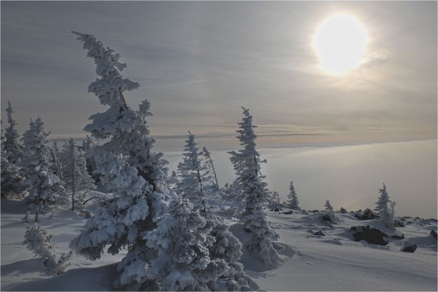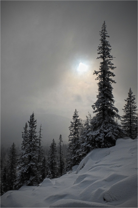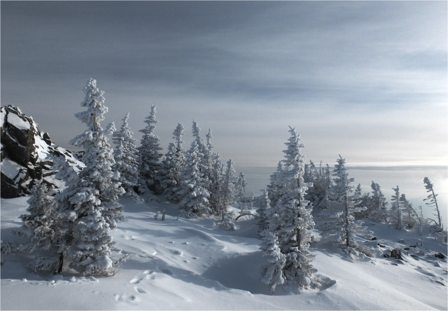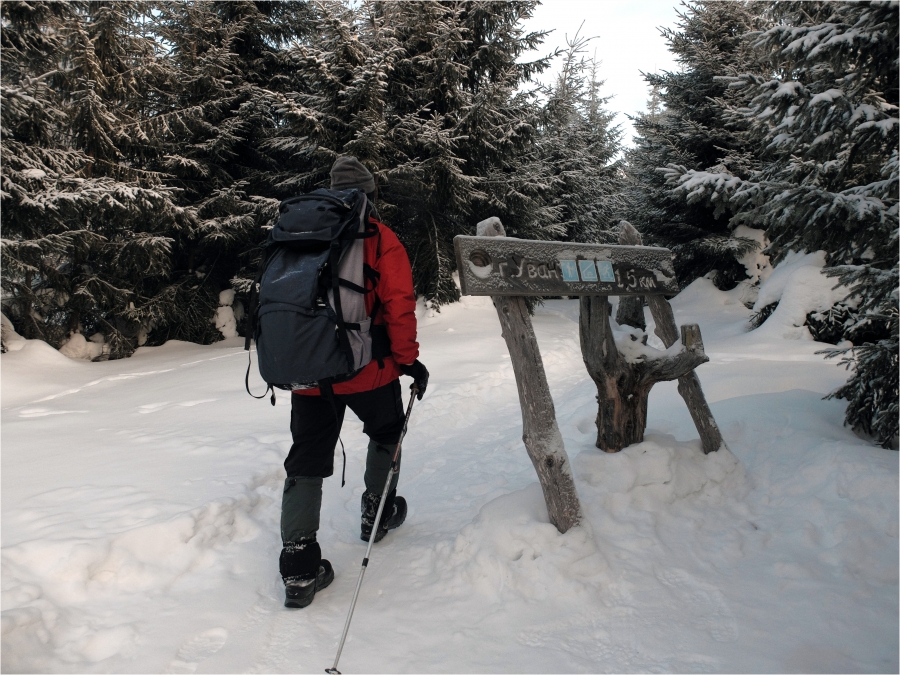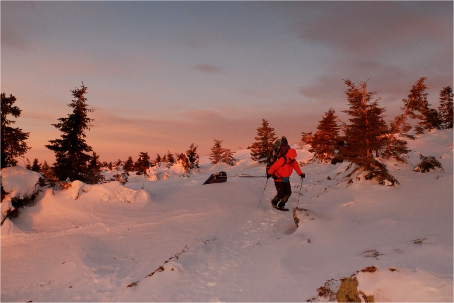 Начало маршрута – пос. Катавка. Раннее утро, а по факту ещё ночь, посёлок спит. Мороз около -27 градусов, стоять холодно, поэтому не тормозим. На Сибирский перевал ведёт снегоходка, видны и многочисленные человеческие следы. Подниматься удобно. На седловине вправо отходит тропа на г. Большая Сука, немного проходим по ней со всем грузом и оставляем его у приглянувшегося дерева. Дальше в радиалку. Тропа не везде набита, местами проваливаешься по пояс, есть настовые крутые участки, где жалеешь об отсутствие кошек.