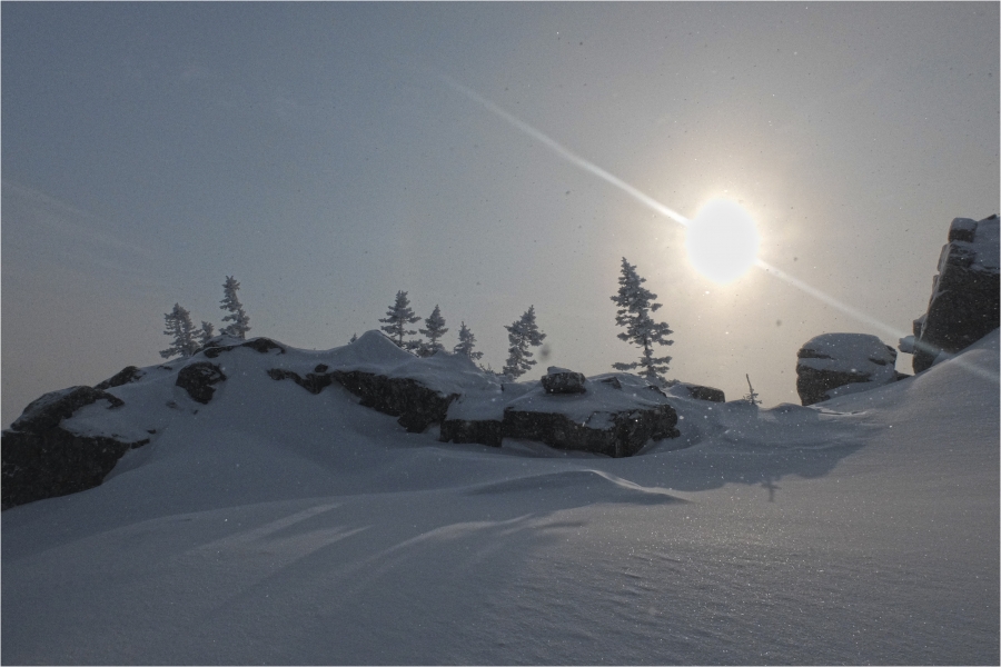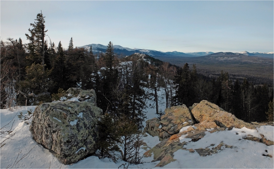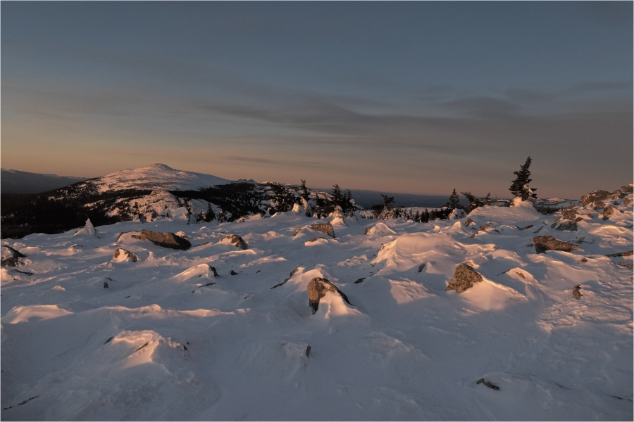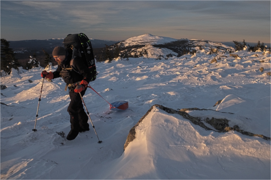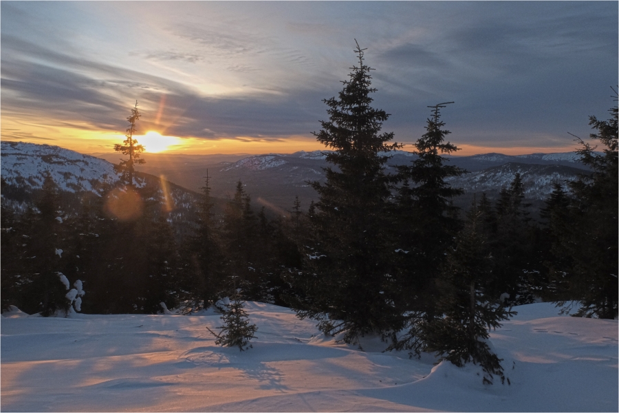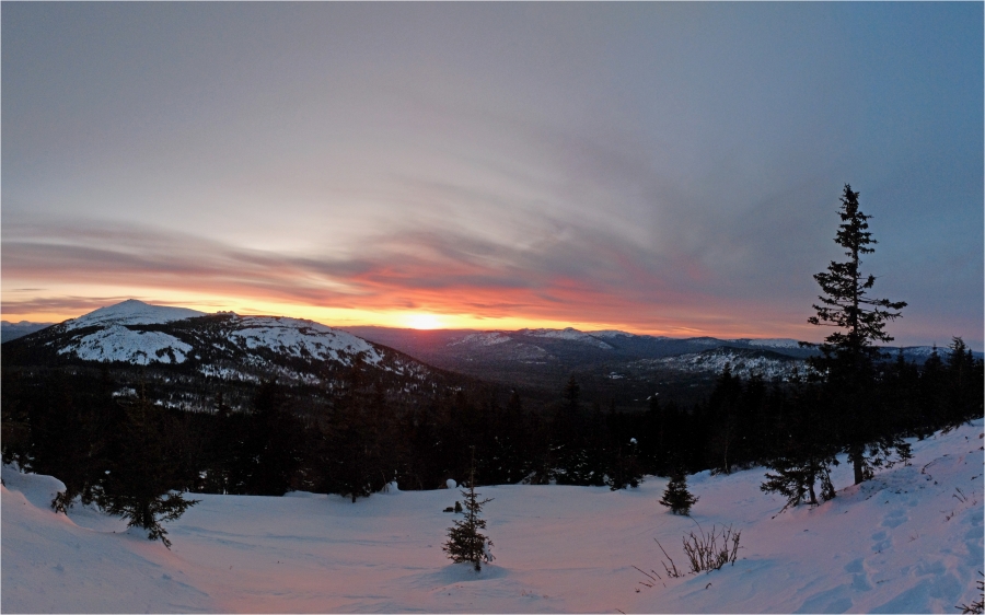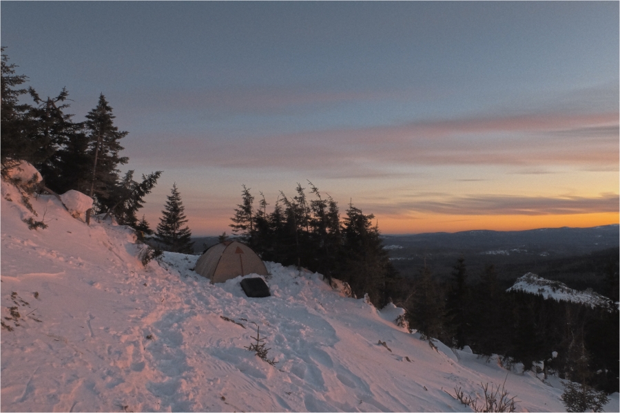 Сегодняшний маршрут лежит через кордон «У трёх вершин» к подножью г. Большой Нургуш. Тропы натоптаны, снегоступы не требуются, передвигаемся довольно легко. На кордоне немного общаемся с ручными лосями. В итоге решили подняться повыше, и как-то незаметно подобрались к плато Нургуш. Долго обустраивали полочку для палатки. Виды отсюда симпатичные, да и закат - то, что надо. Очень живописная стоянка получилась.