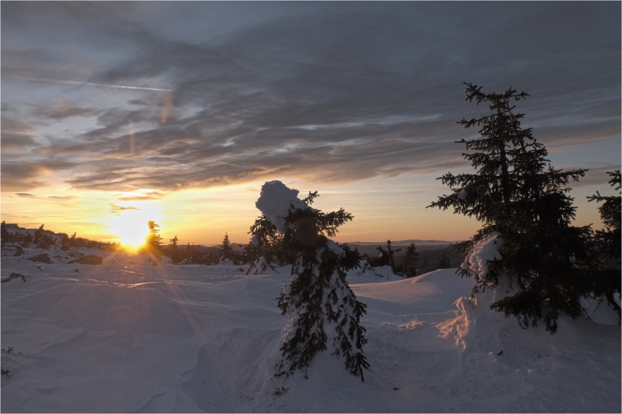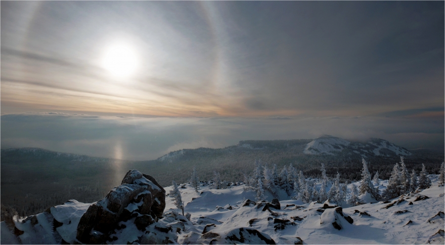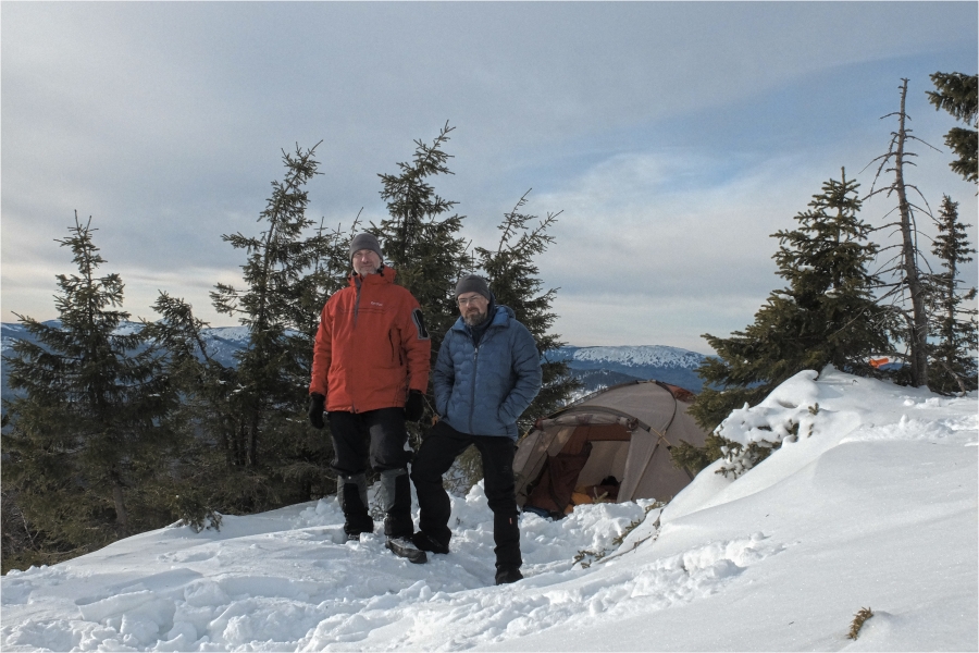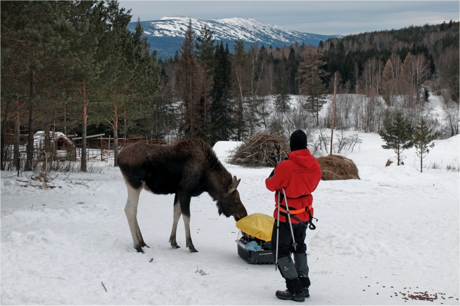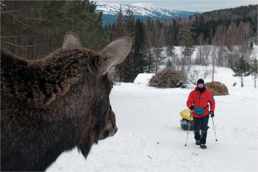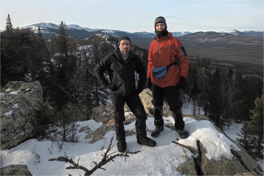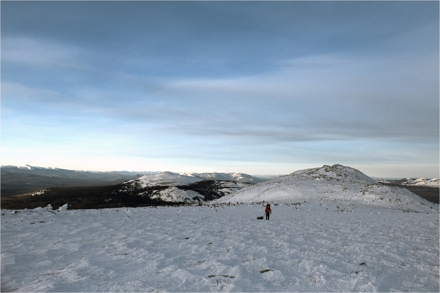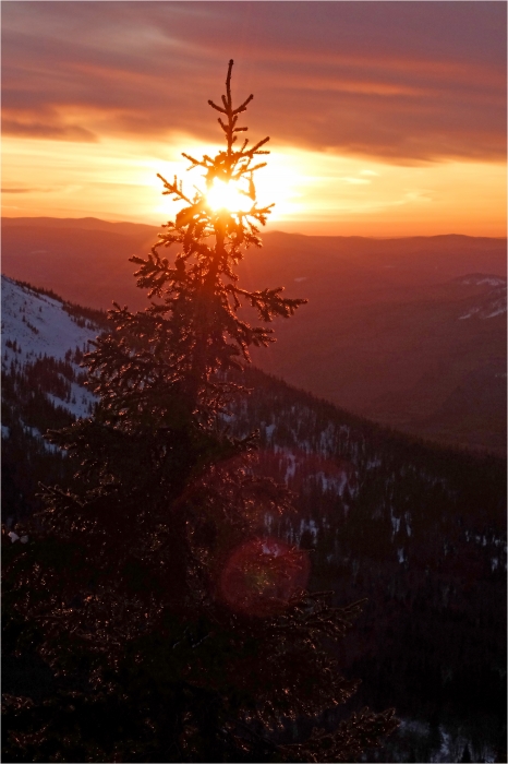 Сегодняшний маршрут лежит через кордон «У трёх вершин» к подножью г. Большой Нургуш. Тропы натоптаны, снегоступы не требуются, передвигаемся довольно легко. На кордоне немного общаемся с ручными лосями. В итоге решили подняться повыше, и как-то незаметно подобрались к плато Нургуш. Долго обустраивали полочку для палатки. Виды отсюда симпатичные, да и закат - то, что надо. Очень живописная стоянка получилась.