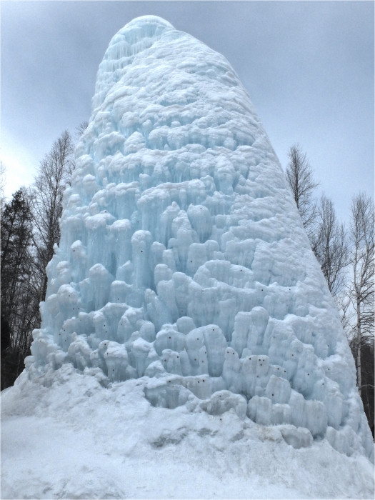 Вернувшись к рюкзакам обедаем, встречая несколько групп туристов, идущих из посёлка на гору. Дальнейший путь к так называемому «фонтану» или «сосульке». Здесь полно машин и народа - к этой достопримечательности ведёт асфальтированная дорога. Признаться, чувствуем себя некомфортно, хочется в лес, в тишину. Как только заметили отходящий от трассы снегоходный след, свернули на него без раздумий. На снегоступах выходим к намеченному месту стоянки и ставим лагерь.