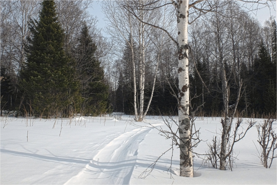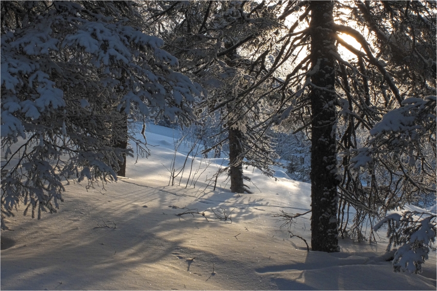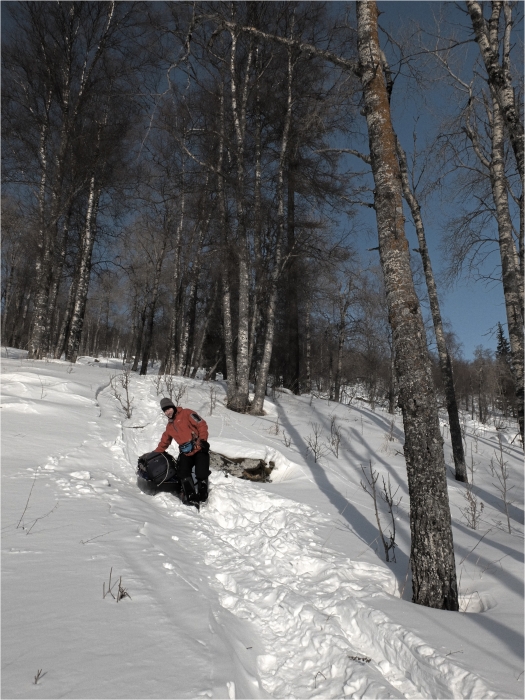 На границе леса одеваем снегоступы. Во-первых, встроенные кошки обеспечивают необходимую безопасность, а во-вторых, скоро наст кончится и без них вообще не пройдёшь. Тропы нет, идём по навигатору и по маркировкам на деревьях. Через пару часов по целине доходим до стрелки с Воровской тропой. Как и предполагали, она прекрасно укатана снегоходами. Идём немного по ней, пока не появляется слабая отворотка вправо, по которой выходим в намеченный район стоянки. Незадолго до стоянки вправо уходит наезженный снегоходный след (завтра он нам пригодится).