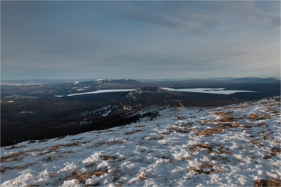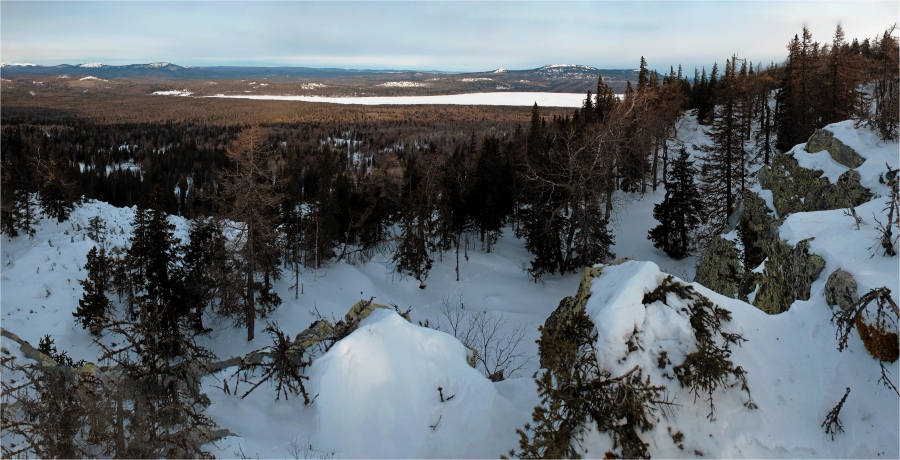 Хочется пройти ходом через гору Лукаш так, как намечали дома. В принципе всё для этой задумки есть – в нужном направлении идёт снегоходка. Но, к сожалению, метров за 400 до вершины она сворачивает в сторону озера. Ругнувшись, оставляем рюкзаки и на снегоступах выходим к видовой точке. При этом обнаруживаем рядом с ней натоптанную тропу, идущую в сторону озера, но уже поздно что-либо менять. Вернувшись, немного двигаемся по снегоходному следу, однако вскоре понимаем, что люди просто катались, поэтому одеваем снегоступы и выходим на «трассу», что уходила вчера вблизи стоянки. По ней быстро доходим до озера и организовываем лагерь на берегу.