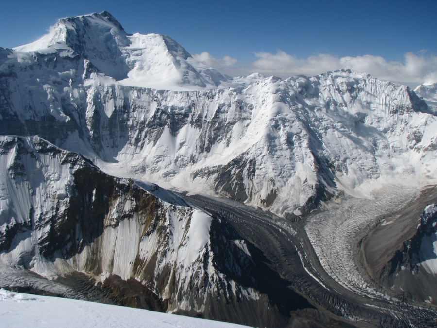 Краткое описание:Пик Коммунизма и Памирское фирновое плато из лагеря 6300 на Корженевской
