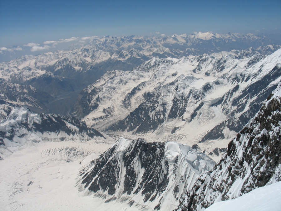 Краткое описание:Ледники Беляева, Гармо, отроги хребтов Петра Первого и Дарвазского. Вид на запад с перемычки Душанбе-Коммунизм