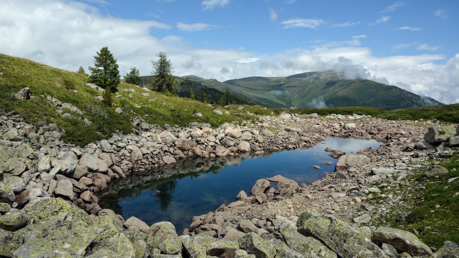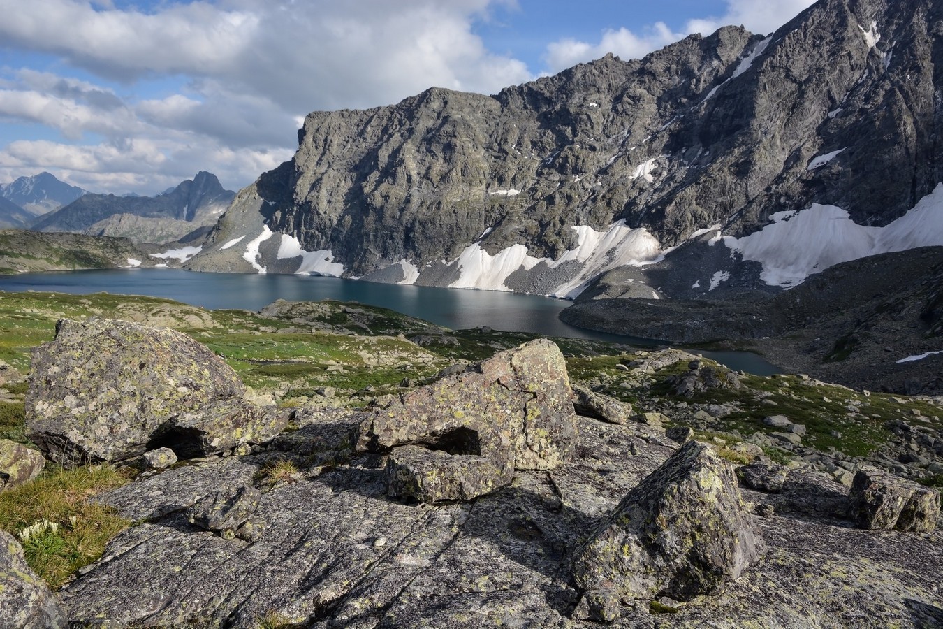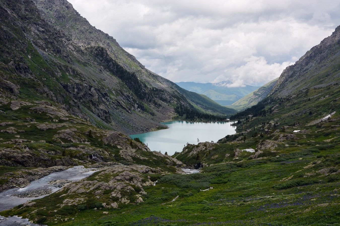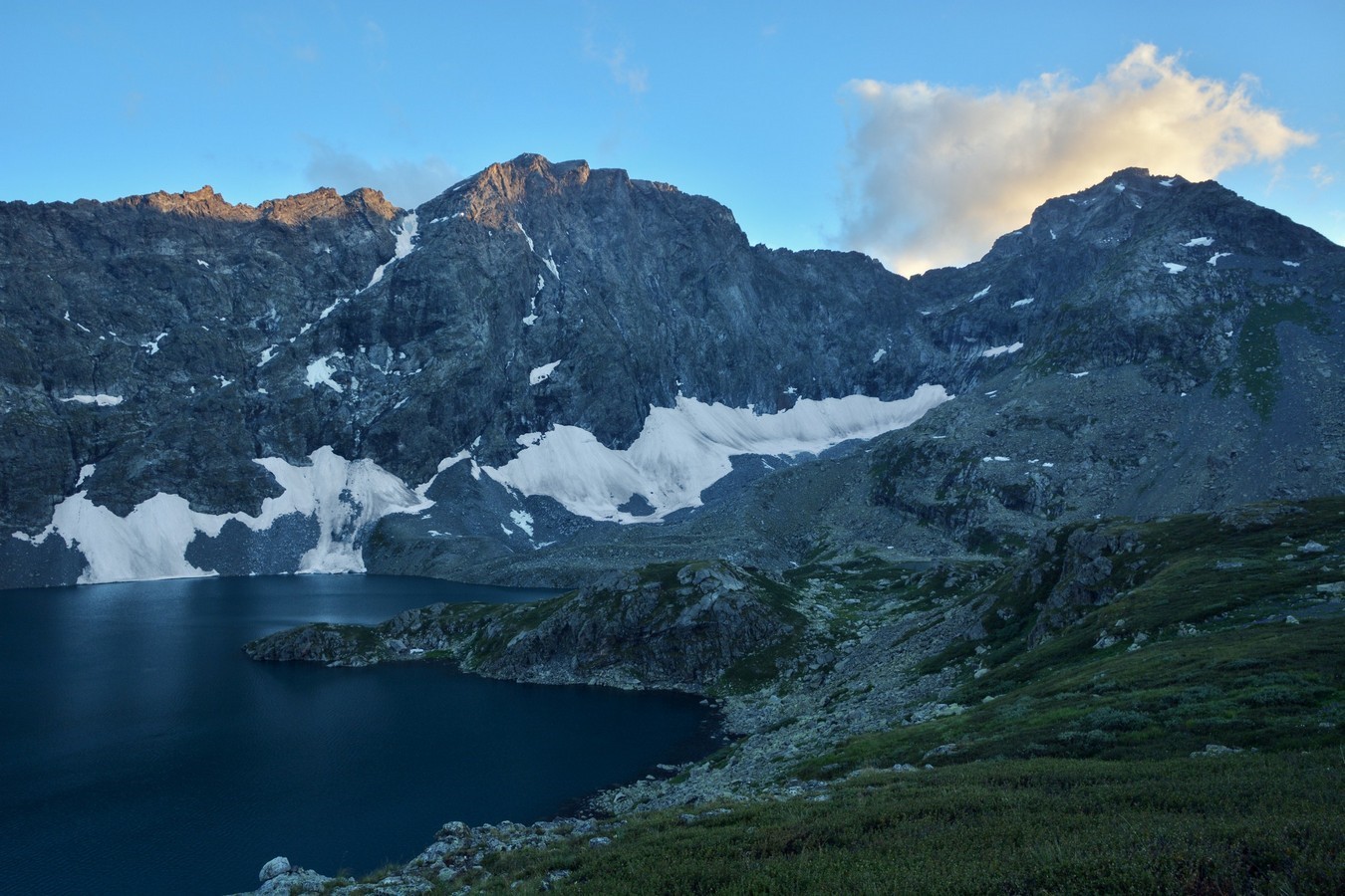 Решил ещё подняться повыше, чтобы увидеть верхние озёра. Но закрапал опять дождик, посмурнело, и я, решив, что это надолго, вслед за Юлей вернулся в лагерь. Только дошли до палаток, как опять выглянуло солнышко. Что ж, чем не повод пройтись ещё раз с фотоаппаратом? Пошёл в сторону Курагана, где над речкой и самим хребтом живописно курились густые белые облака. Озерцо, которое приметил, ещё вырубая тентовый шест, оказалось чудо как хорошо!