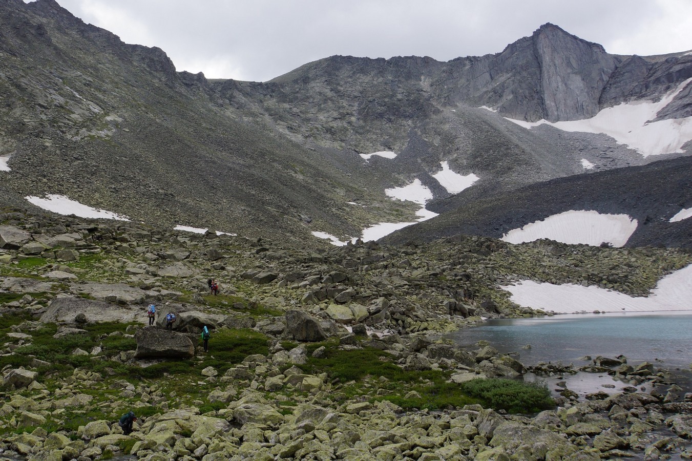 После очередного такого вот мокрого препятствия вышли к озеру, которое приняли за искомое Крепкое. Народ разочарованно разглядывал его обыденные виды. Но вышедшие из стоящей на берегу палатки женщины сказали, что до настоящего Крепкого ещё два часа такой же хреновой тропы. Кстати, дождь потихоньку накрапывал, и цирк Крепкого был окутан туманной пеленой. Два часа туда, два обратно и путь назад вырисовывались в приход в лагерь часов в 10 вечера, то есть уже затемно. Было очень грустно: стоять в двух шагах от цели и не достичь её….