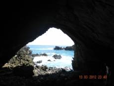 Зачем они делались, перетаскивались по острову, а затем водружались на головы статуй?! Непонятно! Ну, не для красоты же!.. Далее было запланировано посещение вулкана Рано-Као, но гид беспокоилась, что после сильного дождя мы не сможем подняться по крутому, грунтовому склону, и мы отдохнули в отеле два часа, чтобы дать дороге просохнуть. По пути к вулкану заехали к живописной бухте с вулканическим гротом.