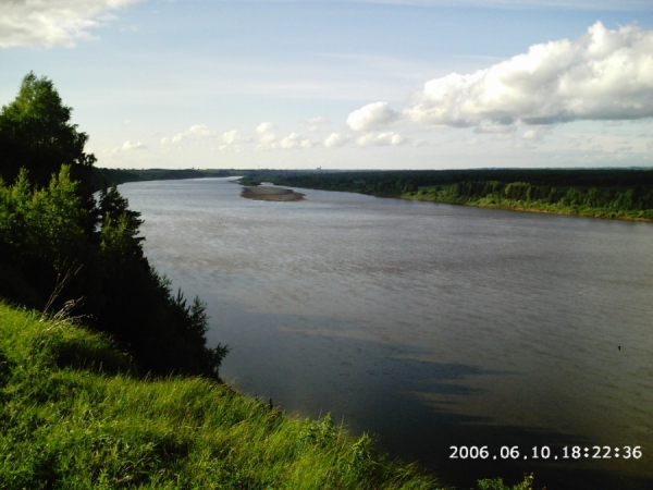 После всего сказанного мы и сейчас не уверены, что получим точную информацию. Проехав деревню, мы видим пологий, поросший зеленой травой берег реки Вятка и бескрайние красивейшие пейзажи лесов на противоположном берегу с песчаными плесами. Слева от деревни - кладбище, на нем много посетителей, выходной день. Из них мы выделяем двух мужичков, идущих в нашу сторону. У одного из них большая залысина и огромная, лопатой, борода. Второй в кепке, брит, имеет хитрые с прищуром глаза. Так вот они какие мужики вятские, руки хватские!!! Решаемся к ним обратится и узнать у них: не знают ли они, где тут находят скелеты ископаемых звероящеров. К нашему великому удивлению в этом случае мы получаем от этих двух вятских мужиков абсолютно точный, исчерпывающий и понятный ответ: вас интересует, где проходят раскопки древних животных? Раскопки проводятся вдоль всего правого берега реки Вятки от Котельнича вплоть до нашей деревни. Основные раскопки располагаются у деревень Муха и Боровики. Приезжающие на раскопки палеонтологи квартируются, в основном, в деревне Рвачи у местной жительнице Гали, которой за это Котельнический палеонтологический музей платит небольшую зарплату, как своему сотруднику. Там же, между Рвачами и Ванюшенками (Боровиками) находится очень красивое место Соколья гора. Мы спросили, а слышали ли они о съемках в этих местах центрального телевидения. Да, съемки проходили в основном под Сокольей горой. Выезжайте назад на трассу в направлении на Котельнич до указателя Боровики, сворачивайте направо, на старую Кировскую дорогу, доедете до фермы, примите влево и по второму повороту направо вы прямо попадете на Соколью гору. Мы благодарим мужиков за столь подробный ответ и уже через полчаса наш Рафик стоял в 10 метрах от почти вертикального обрыва реки Вятка, называемого Сокольей горой. Два часа дня, ливней здесь, похоже, не было, а небольшой дождь кончился, и выглянуло солнце.
