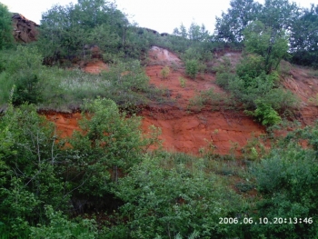 Восторгу нашему нет предела! Мы ходим по земле, по которой более 260 млн лет назад ползали различные твари: звероящеры, парейазавры - далекие предки и млекопитающих, и динозавров. В пластах красной глины на границе воды и берега мы пытаемся найти какие-либо кости. Конечно, мы не палеонтологи и вряд ли что-то такое могли найти, но сувениров мы набрали. Вот этот камень похож на кость, этот на зуб и т.д. В самом центре Сокольей горы, внизу из трубы вытекает родник с очень вкусной и холодной водой. Чуть севернее его мы обнаруживаем крутую, ступенчатую тропу, которую мы не заметили сверху. Поднявшись по ней, мы к нашему удивлению оказываемся у нашей машины...