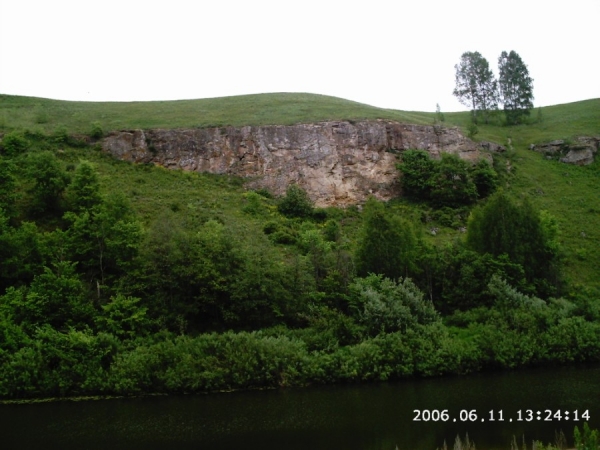 Советск, в Колянуре закупаем продукты, Чимбулатский карьер. Я был здесь год назад. Тогда мы, не зная точно дороги, уехали на юго-восток от проходной карьера и попали на Немду выше по течению деревень Сурнята и Тяптичи. И только потом, двигаясь вдоль левого берега, лишь часа через два нашли самое главное место напротив основных скальных выходов. Зато мы случайно, по пути увидели еще один скальный выход и небольшой водопадик на нем. Лишь потом мы узнаем, что этот скальный выход называют Скалодром, а водопадик Береснятский. Я писал в начале рассказа, что мы сильно переживали из-за сильных ливней, идущих всю неделю в Нижнем и боялись, что земля раскиснет, и мы не сможем проехать по полю на Рафике. Нас очень обрадовало, что здесь, похоже, дождей совсем не было, даже в ямах была сухая, растрескавшаяся земля. В общем, опять пронесло. Да и к тому же сейчас, уже зная дорогу, я, недоезжая метров 200 до проходной, смело поворачиваю направо, на полевую дорогу и, в отличие от прошлогодней ошибки, метров через 200-250 нахожу дорогу налево. Полевую дорогу здесь каждый год перепахивают, и она может менять свое положение. Главный ориентир - это огромный отвал карьера, надо держать направление вдоль него справа, двигаясь практически на север. Оставив отвальную гору левее и позади себя, продолжая двигаться в том же направлении, метров через 500 появилась табличка Чимбулатский ботанико-геологический комплекс. После нее начинается спуск к левому берегу реки Немда. Спускаясь, начинаешь понимать, что приближаешься к чем- то грандиозному. Это, конечно, не настоящие горы, но красивый скальный амфитеатр на противоположном берегу впечатляет. Немда в этом месте делает большой подковообразный поворот, внутри которого находится огромная зеленая поляна, на которую мы и спустились.