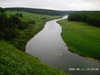 Вскоре он уезжает, и мы остаемся в Чимбулатском комплексе совсем одни. Странное дело: в первую ночь комаров прибивал сильный дождь, на Сокольей горе их были тучи, особенно под вечер, здесь же, в Чимбулате, их почти совсем не было, и это в самое комариное время! Может, им здесь просто негде разводиться, да и дождей, похоже, не было недели три. Обедаем, всего еще только два часа дня. Надуваем резиновую лодку и отправляемся на другой берег полазить по скалам. Правый берег крутой, скользкий, поросший у воды травой и кустами. Двое из нас при выгрузке шлепаются в воду - зачем лодку брали, можно было и так переплыть... Отжавшись, поднимаемся по тропинке на самый верх. Стоя над скалами, открывается замечательный вид на всю округу. Огромная зеленая поляна со стоящей на ней нашей малюсенькой машиной очень живописна.
