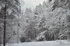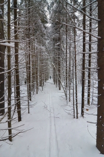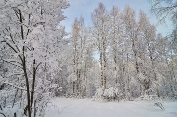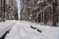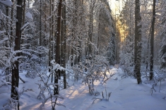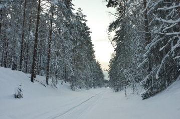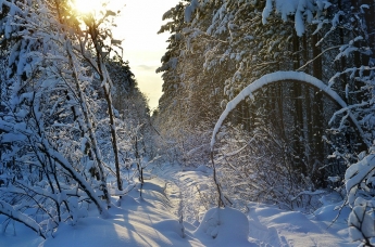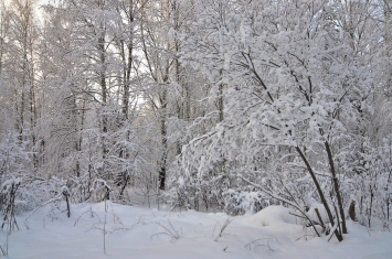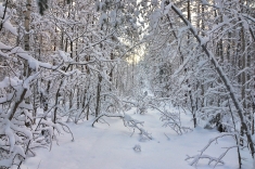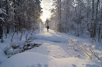 С утра столбик термометра на границе разметки, температура стремится к 30-ти. На улице солнышко, правда, почти не выглядывающее из-за макушек деревьев, но этого уже достаточно, чтобы скупые зимние краски заиграли цветами. Так как останки дороги густо заросли кустами, решено идти вдоль нее по лесу, благо лес чистый и вполне проходимый. Примерно через километр замечаем, что дорога, хотя и остается ненаезженной, но кустов стало меньше, и по ней уже можно идти. Это вселяет в нас оптимизм и надежду, что дополнительный день не понадобится. |