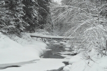 На берегу в кустах свежая лежка лося. Так как идет слабый снег, то видно, что лось ушел недавно, снег еще не успел ничего припорошить. Немного идем по его следам. Следы тянутся вдоль русла, пересекают его и уходят в лес на другом берегу. Вся пойма изрисована следами зайцев. Похоже, что зайцев здесь много - их следы сопровождают нас почти до конца похода. |