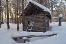 В районе урочища Лесоучасток №11 (предположительно, оставшегося на месте 11-го лагеря Унжлага) лес расступается и мы выходим на широкую не заросшую луговину. Впервые за последние дни мы замечаем старые заметенные снегом следы буранки. Это очень радует, так как угадать, где находится продолжение дороги в сплошной стене леса за луговиной, просто невозможно, а следы старой буранки выводят нас прямо на нее. На противоположном конце луговины обнаруживаем разрушенную избушку, от которой целыми остались разве что стены. |