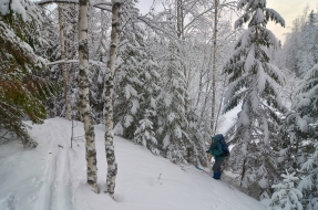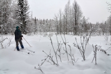 | Маршрут наш на карте выглядит как четырехугольник и составляет примерно 56 км. Решено стараться проходить в день как минимум по 14 км, что примерно соответствует одной стороне четырехугольника. Останавливаемся на перекус. Если верить навигатору, идти нам сегодня еще долго. После перекуса счистили с лыж налипший снег, после чего они наконец-то начали скользить. Новый подлип уже не образуется – значит наконец-то начало холодать. Идти стало легче и быстрее. |