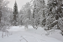 На следующий день становится теплее - с утра 20 градусов. И это реально ощущается – щеки и руки без перчаток мороз не обжигает. Солнышка опять нет, лес серый, идет небольшой снег. Как не хватает снежным шапкам на деревьях солнечного освещения и голубого неба! Фотографии получаются серыми и скучными, хотя кругом красотища. Сегодня по плану у нас самый тяжелый день – по карте дороги нет, на космоснимке она тоже практически не просматривается, т.е. из запланированных 14 км, семь - практически азимутом через лес. Но если смотреть план-схему Унжлага, то вдоль Торзати нарисована дорога. Интересно, что от нее сохранилось сейчас? |