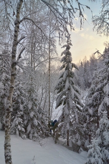 Наконец-то собрались, надели лыжи, побежали. На ходу становится тепло, останавливаться не хочется. Оказалось, что вчера не дошли совсем чуть-чуть до нормального соснового леса. Жаль. Но будем знать на будущее, что за километр до Северного есть хорошие места для ночевки. |