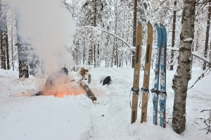 Стоянка в красивом сосново-еловом лесу. Без лыж ходить трудно, проваливаешься по колено и глубже. Яму под костер роем долго – снег глубокий, сверху рыхлый, потом идет толстый слой наста, который пробивается с трудом. На удивление, под настом снег влажный, еще не промерз. Дым от костра вьется в небольшой яме - большую сделать не хватило терпения и сил, да и сушина попалась неудачная, сильно чадит. На градуснике минус 17. Ложимся спать. |